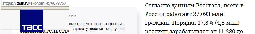А как же заявление О. Голодец в феврале 2017 г. о том, что 4,9 млн. работников в стране получают на уровне МРОТ. Тогда это – 7500 рублей. А ТАСС сообщил 18 июля 2019 г. (https://tass.ru/ekonomika/6679757) со ссылкой на Росстат, что 775,46 тысяч россиян (2,9% от числа трудоспособных (?)) получают зарплату ниже установленного МРОТ. Еще 17,8% получают зарплату до 20300 рублей. Если совместить эти две информации, то можно предположить, что вряд ли 4,2 млн. человек резко улучшили своё материальное положение за 2018 год. Реально здесь, я думаю, вкралась ошибка: О. Голодец назвала цифру общую по стране, а ТАСС – по результатам выборочного опроса, тем более что трудоспособных у нас почти в 4 раза больше, чем по оценке ТАСС: