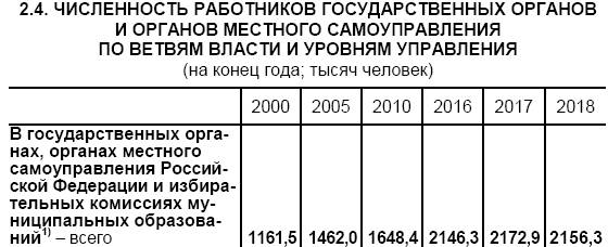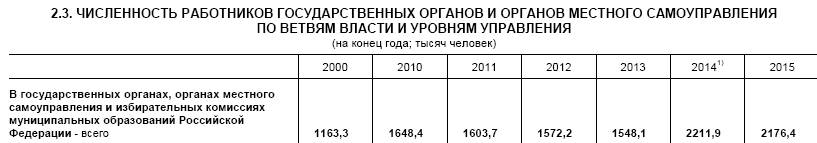 Мы видим, что численность за 2000 г. поменялась. Значит, могли поменяться и за 2012–2015 годы. Итоговой цифры нет. Поэтому, пересчитав чиновников всех уровней построчно по двум справочникам, получаем следующие итоговые данные: