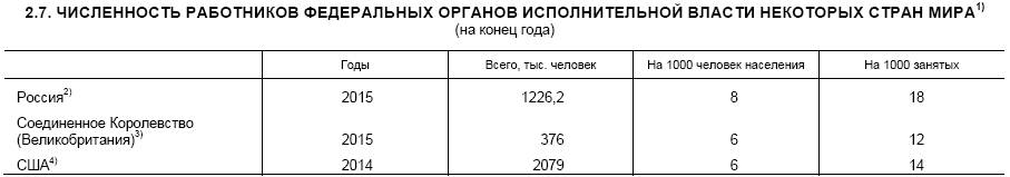 Тенденция очевидна: видим рост числа работников госорганов на фоне убывающего по численности рабочего класса и крестьянства. Отсюда вывод: чем больше госслужащих – тем хуже управление и забота о развитии. Их число уже составляет 2/3 от численности квалифицированных рабочих, занятых во всей отечественной обрабатывающей промышленности. Это примерно 90 человек с окладами значительно выше, чем у рабочего, на 1000 рабочих мест (относительно всего трудоспособного населения). А если россиян занято только 27,093 млн., то уже 237 чиновников на 1000 рабочих мест, занятых россиянами. Справочник «Россия в цифрах. 2016 г.» даёт сопоставительные сведения по числу работников федеральных органов исполнительной власти: