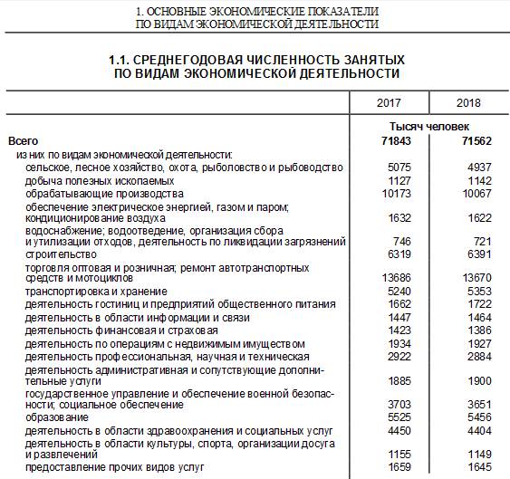 Статистика приводится из общей численности занятых – 71491 тыс. человек (если сложить построчно занятых за 2018 г.), хотя в строке «всего» мы видим – 71562 тыс. человек.