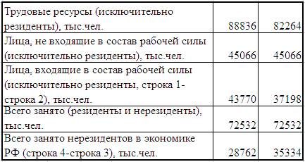 Кто такие «лица, не входящие в состав рабочей силы»? Пенсионеры и малолетние? Нет. В сумме они дают 121256 тысяч человек (76190+45066), а должны были дать либо всё население, либо всё трудоспособное население: баланс должен сходиться на какой-то итоговой строке. Разница с общей численностью населения – 25624 тыс. человек (как раз число малолетних до 15 лет), а разница с численностью трудоспособного населения, учитывая, что его оценки разнятся в статистике от 82264 тыс. чел. (табл. 4.2) до 88836 тыс. чел. (см. таблицу Росстат в статье «Кому мешает жить призрак?») – это от 32 (121256–88836) до 39 млн. человек (121256–82264) сверх численности трудоспособного населения. Следовательно, можно утверждать, что статистика по «занятым» учла значительную часть иностранной рабочей силы, занятой в нашей экономике. Поскольку в учете трудоспособного населения и незанятых речь может идти только о россиянах, можно, исходя из этих данных, ориентировочно оценить число нерезидентов, занятых в экономике России. Сведём выводы в таблицу (2 сценария):