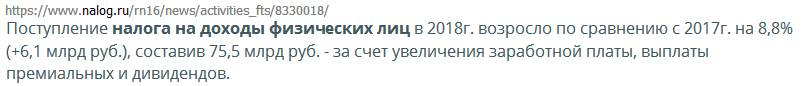 Как видим в структуре получается, что на одного человека, получающего доход в результате создания добавленной стоимости, приходится в среднем 6,4 человека, которые строят, продают, перепродают, руководят и управляют денежными потоками. Поскольку Росстат не в состоянии посчитать точно даже число чиновников, все версии расчётов структуры занятости в целом по всем секторам экономики имеют право на существование. Попробуем проверить эти расчёты на налоговых сборах. Исходим из того, что все россияне, занятые в экономике, платят налог на доходы физических лиц. Итоговая сумма сборов составила 75,5 млрд. рублей: