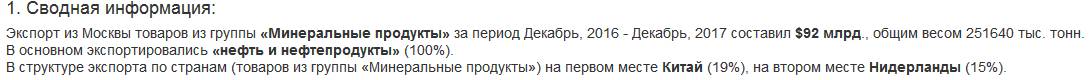 А де-факто – только одна – нефть и нефтепродукты, рыбы – на 600 млн.$.И вот ещё что любопытно: Сахалин – нефтедобывающий регион, экспортирует нефти на 10 млрд.$. А вот Москва – совсем не добывает нефть, а экспортирует по данным ФТС на 92 млрд.$. :
