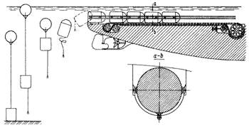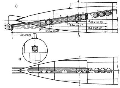 Всего труб, соединявших переборки, было семь. Из них труба наибольшего радиуса (1 м) находилась в верхнем отделении, ось ее совпадала с осью симметрии лодки.