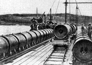 Каждый из рядов мин борта начинался несколько впереди носового входного люка заградителя и кончался на расстоянии приблизительно двух мин от амбразуры. Крышки амбразуры – металлические щиты с рельсами для мин. Мины были снабжены якорем – полым цилиндром с приклепанными внизу кронштейнами для четырех вертикальных роликов, которые катились по рельсам минных путей. В нижней части якоря были установлены два горизонтальных ролика, входящих в червячный вал и при вращении последнего скользящих в его нарезке и перемещавших мину. Когда мина с якорем падала в воду и занимала вертикальное положение, специальное устройство отсоединяло ее от якоря. В якоре открывался клапан, в результате чего вода поступала внутрь якоря и он получал отрицательную плавучесть. В первый момент мина падала вместе с якорем, а затем всплывала до заранее установленной глубины, так как обладала положительной плавучестью. Специальное приспособление в якоре давало возможность разматываться минрепу до определенных пределов в зависимости от заданной глубины постановки мин. Все приготовления мин для постановки (установка глубины, запальных стаканов и т.д.) выполняли в порту, так как после приемки мин в надстройку заградителя к ним уже невозможно было подойти.