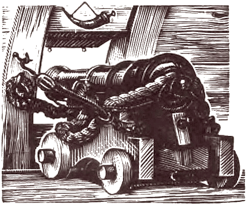 Для того чтобы пушку не откатывало далеко после выстрела, ее крепили к боковым стенкам пушечных окон-портов толстым тросом, который назывался брюк. Кроме того, были еще пушечные тали с блоками, при помощи которых орудие подкатывали к порту перед боем и откатывали после боя. В походном состоянии, при закрытом порте, ствол пушки поднимали, чтобы он касался верхнего косяка порта, и накрепко притягивали талями к борту.