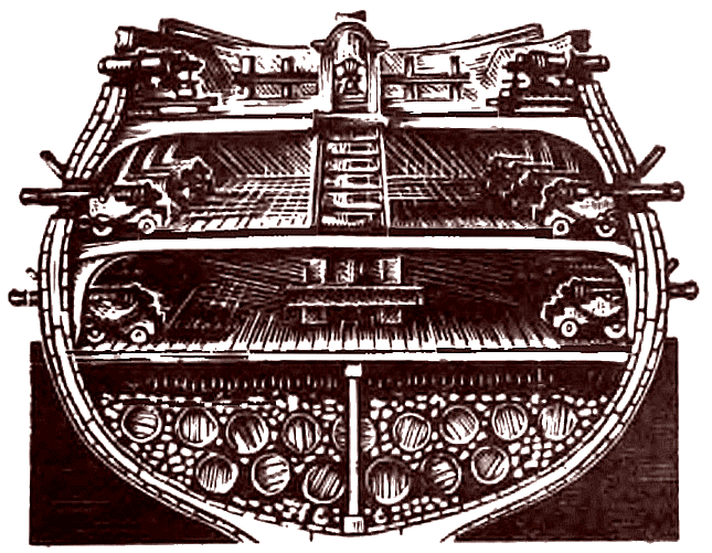 По количеству деков с орудиями, не считая верхней, открытой, палубы, военные корабли разделялись на двух– и трехдечные. Третья, закрытая, орудийная палуба называлась гон-дек. Под гон-деком находился орлоп-дек, или трюм, где хранились продукты и в специальном кормовом помещении – крюйт-камере – бочонки с порохом и снаряды. В крюйт-камеру опускались по лестницам-трапам через люки в палубах.