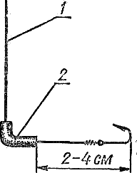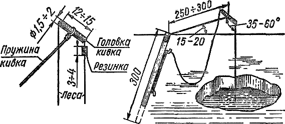 Хорошо зарекомендовала себя зимняя донная удочка с кивком. Кивок изготавливают из пружинной проволоки диаметром 0,4–0,5 мм. Для этого нужен кусок длиной 400 мм. На одном конце проволоки делают пять витков диаметром 7–9 мм. Они служат для крепления кивка на кончике удильника. На втором конце делают 3–4 витка диаметром по головке кивка – трубочке из жесткой цветной пластмассовой изоляции со слаботочных проводов. На головку кивка нужен отрезок длиной 15–20 мм. Важно, чтобы отверстие трубочки превышало диаметр лесы на 0,3–0,5 мм. Грузило должно быть минимальным по весу, но чтобы оно погружало и удерживало на дне приманку. Удильник из твердых пород дерева длиной 400 мм, с мотовильцами или катушкой для запаса лесы длиной 15 м. Когда рыба берет приманку, кивок вздрагивает, а если рыба идет, забрав приманку в рот, он, пропуская лесу, будет непрерывно качаться и вздрагивать (рис. 35).