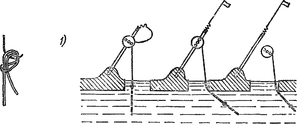 Живец наживляется на двойник или тройник (двойной крючок лучше – он хорошо маскируется на теле рыбки), выше на 20–30 см помещается грузило. Леса диаметром 0.5 мм цепляется или настораживается сторожком. Если она намотана на мотовильца, запас лесы в 2–4 м укладывается на лед, чего не требуется делать при катушечной снасти (рис. 37).