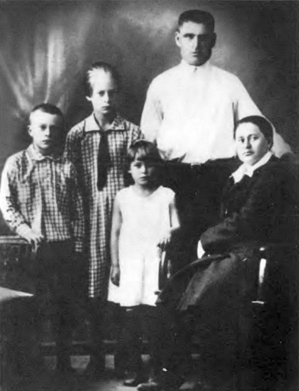 Петя Плешаков с сестрами (старшая Евдокия, младшая Александра) и родителями Степаном Ивановичем и Еленой Ильиничной. 1931 г.