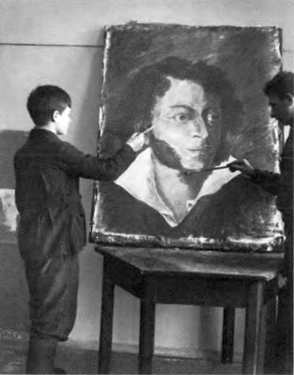 Петя Плешаков с соавтором выполняет портрет А. С. Пушкина к столетию со дня смерти поэта. 1937 г.