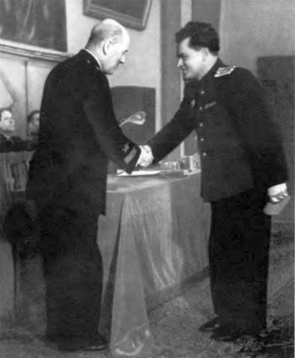 П. С. Плешаков поздравляет заместителя директора ЦНИИ-108 В. И. Морозова