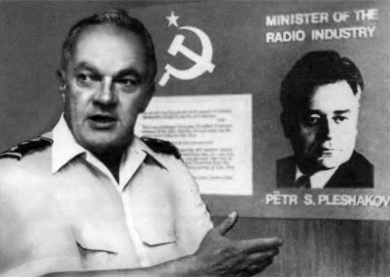 Начальник управления электронных систем ВВС США генерал-майор Д. Стэнсберри у фотографии П. С. Плешакова. «Этого человека мне надо победить. Его портрет каждый день напоминает мне о том, что я должен быть впереди». Фото из журнала «Electronics», 1981 г.
