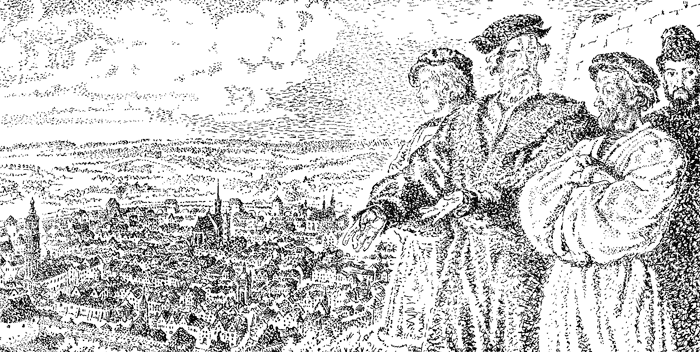 – Вот! – сказал печатник. – Смотрите сюда: город. Большой, богатый, красивый. Надо всеми домами – костел. Пока что этим костелом он и славен. Но мы можем поставить здесь типографию и академию. Без царя. Без князя. Без гетмана. И повезут отсюда книги в Москву, Киев, Чернигов, повсюду. А ученые юноши после академии пойдут по всей нашей земле нести науку. И ведь мы это можем сделать. Можем! Это я тебе говорю, Гринь! И тебе, Иван!