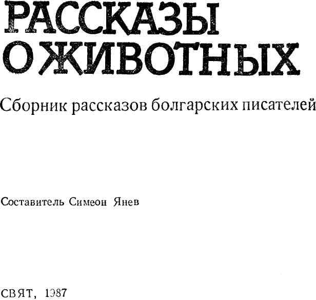 В настоящем сборнике рассказов произведения сугубо аллегорического характера не представлены по той причине, что они не являются анималистическими в подлинном смысле этого слова. Цель книги «Рассказы о животных» – показать на основе по возможности строгого отбора процесс развития и современное состояние анималистической темы в болгарской литературе. Вот почему в книгу включены не только произведения писателей, в творчестве которых эта тема разработана достаточно широко, ко и авторы, у которых она носит в большей или меньшей степени эпизодический характер и которые добились тем не менее в ее воплощении серьезных эстетических успехов. Поскольку отбор произведений осуществлялся по жанровому признаку, в книгу не вошли такие замечательные образцы прозы, посвященные жизни животных, как повести Эмилияна Станева «Чернушка» и «Фокер», повести и новеллы других современных писателей, а также отрывки из романов, воспоминаний, путевых заметок разных лет, без которых картина развития болгарской анималистической прозы, несомненно, является неполной. Тем не менее, несмотря на все ограничения, о которых шла речь выше, читатель, по нашему мнению, получит довольно ясное представление как о тематическом разнообразии произведений, так и о внутренней эволюции и основном содержании данной темы в рамках одной национальной литературы.