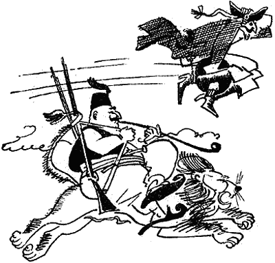 И вот впереди показалось что-то чёрное и гигантское. Тартарен стреляет и слышит ужасный рёв. «Ага!» – кричит охотник, хватаясь за нож. Но напрасно он схватился за нож; у ног его лежит не грозный царь пустыни, а безобидный домашний ослик! Прибежала хозяйка ослика и избила Тартарена палкой. Так печально закончилась его первая охота на львов.