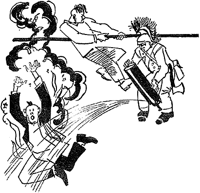 На сцену вразвалку вышел толстый дядя в белых шароварах, в короткой куртке и с широченным красным поясом. На каждом плече у него было по тяжёлому ружью, за поясом торчал огромный охотничий нож, на животе – патронташ, на боку – револьвер.