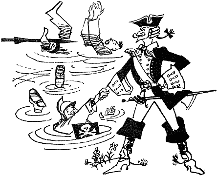 Мюнхаузен окончил свою речь и пошёл со сцены, стуча каблучками, позванивая шпорами и насвистывая пиратскую песенку.
