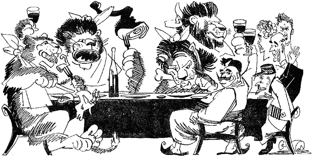 За стол я усадил своих африканских знакомых. Теперь оставалось позвать львов. Это не представляло для меня никакого труда. Я дважды выстрелил, и стая львов прискакала из пустыни.