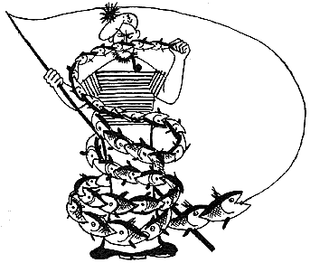 И вот слышу – рыбы между собой разговаривают. Я за удочку. И только забросил – сейчас же на крючок прицепилась рыбка. А я жду, удочку не вытаскиваю. Первую рыбку хватает за хвост вторая, вторую – третья, третью – четвёртая, четвёртую – пятая…