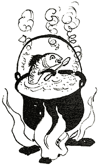 Я развёл огонь, повесил над огнём котёл с водой, бросил в котёл рыб и закрыл котёл крышкой.