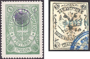 На марках первого выпуска в 1 и 2 мет. изображены русский герб и надпись на французском языке «Ретимно: Временная почтовая марка». Марки печатались вручную на гладкой бумаге, без зубцов.