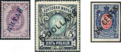 В 1917 в связи с колебаниями валюты была подготовлена серия марок с 18 номиналами с надпечатками новой стоимости в китайской валюте (от 1 ц. до 10 долл.). Надпечатка была произведена на марках России 1902, 1909—17. Известны различные наклоны надпечатки, а также двойные и перевернутые надпечатки. Марка в 14 ц. существуют без зубцов. Марки этой серии продавались также на почтамтах Петрограда, Москвы и Казани.