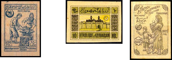В октябре 1921 были выпущены почтово-благотворительные марки в пользу голодающих Поволжья. Марки без зубцов с клеем и без него. Существует большое кол-во разновидностей. В октябре 1921—январе 1922 была выпущена серия стандартных марок Азербайджанской ССР оригинальных рисунков – символические изображения, архитектурные памятники, нефтепромыслы. Марки без зубцов. Отпечатаны литографским путем на серой бумаге без клея. Иногда встречаются экземпляры с клеем. Существует много разновидностей. Известны тет-беш марки в 3000 руб. Марка в 500 руб. известна с номиналом в 50 руб., что было вызвано дефектом клише.