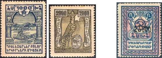 В январе 1922 в обращение поступила серия из 16 марок оригинальных рис. – эмблема Красной Армии, гора Арарат, рыбак на оз. Севан, улица в Ереване и т. д. Марки выпущены с зубцами и без зубцов. Марка в 25000 руб. известна коричневая (вместо синей). Существует ряд пробных марок.