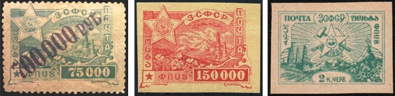 В апреле 1923 в обращение поступили марки России с надпечаткой пятиконечной звезды с буквами «ЗСФСР». Эти марки были подготовлены для всей федерации, однако использовались только в Азербайджане из-за отсутствия почтовых марок. Они продавались и использовались из расчета 1 коп.=1000 руб. в закавказской валюте. Положение звезды на марках различно. Для надпечаток использовались 22 каучуковых штампа. Существует ряд разновидностей. Марка в 3 р. 50 к. была подготовлена, но в почтовое обращение не поступила.