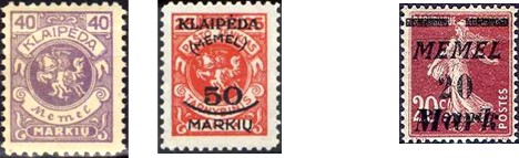 Ден. единица: 1 марка=100 пфеннигам, с 16 апреля 1923 по 3 марта 1939 1 лит=100 сенту, с 1939—45 1 рейхсмарка=100 пфеннигам, с 1945 1 рубль=100 копейкам. После отделения Клайпедского края от Германии (10 января 1920) на его территории вначале использовались марки Германии. 20 августа 1920 в обращение поступили марки Германии с надпечаткой «Memelgebiet». Серия состояла из 17 номиналов и находилась в обращении до 30 октября 1920. Известны разновидности. С 7 июля 1920 в обращение стали поступать марки Франции с надпечаткой «Memel» и новой стоимости в местной валюте. Такие марки выпускались до 1923. Подготовленная в 1923 марка номиналом в 500 м. л./5 фр. в обращение не поступила. Тираж 150 экз. Кроме почтовых марок было выпущено 3 серии авиапочтовых марок с надпечаткой «Flugpost». Существует большое кол-во разновидностей, опечаток, марок в парах с промежуточными купонами и т. д. Все марки с надпечатками изъяты из обращения 31 марта 1923. В 1920 было выпущено также 4 почтовые карточки и 1 почтовый перевод, изъяты из обращения в том же году.