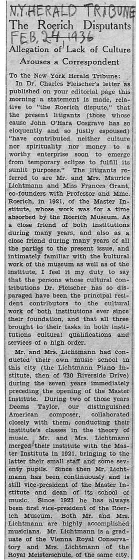Публикация Дж. Г. Ф. Стокса в защиту Ф. Грант, З. Г. Лихтман и М. Лихтмана. Газета «New York Herald Tribune». 19 февраля 1936 г.
