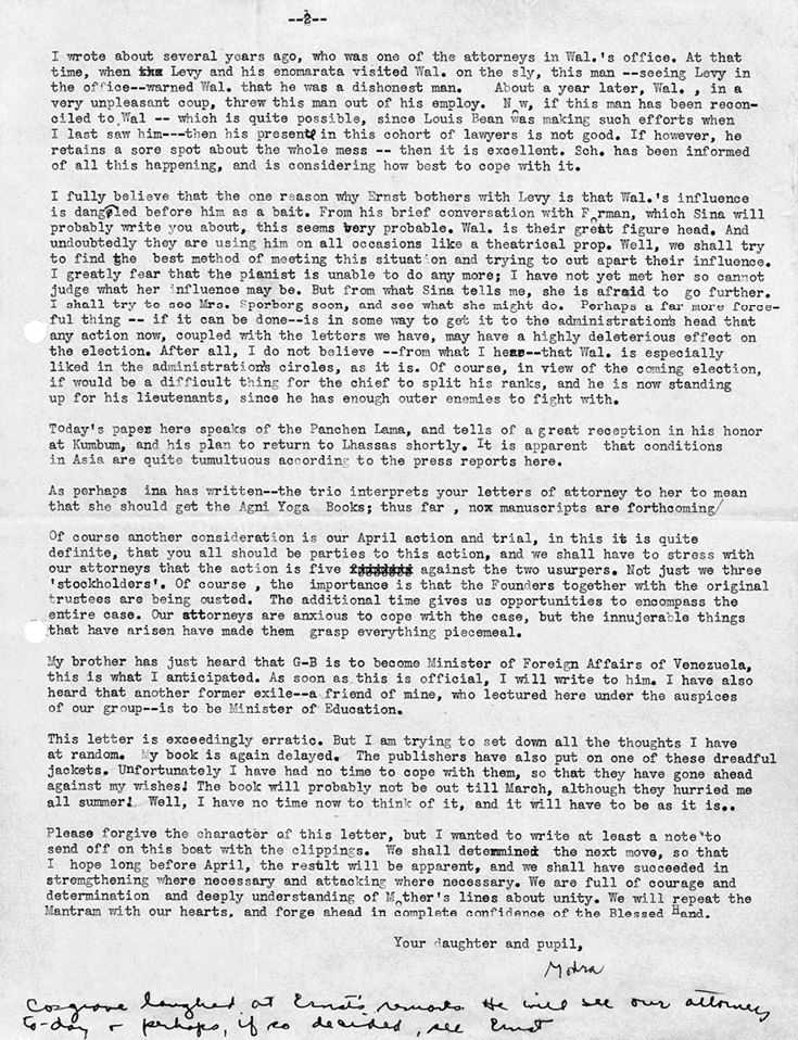 5. Когда именно была снята надпись с Музея? Из этого мерзкого жеста Вы можете заключить, насколько мелко зловредны все попытки со стороны трио. Ведь Мастер-Институт существовал с самого начала. Кроме того, здание называлось Мастер-Билдинг[87]. Так, по крайней мере, оно называется на официальных программах, например, на Ресепшен[88], данном мне в 1929 году по приезде. У Вас должна быть программа этого Ресепшена, когда в числе Комитета было упомянуто очень много значительных имен. Наверное, среди этих имен находятся многие и сейчас полезные. Также в письмах Леви за [19]33 год часто упоминались имена гг. Моффлета и Андерсона, оба из Вашингт[она], как друзей Стокса. При этом Анд[ерсон] интересовался Живой Этикой. Всякое выяснение через друзей крайне полезно, ибо те не дремлют в рассылке своей отвратительной гнусной клеветы и лжи. Что писатель Крист[офер] Морлей, которому был устроен завтрак и кот[орый] так прекрасно, по словам Леви, писал о Музее в своей книге? Что Сильв[естр] Виррик и др[угие] дружественные писатели? Нужно помнить Упоминание о писателях. Наверное, Франс[ис] уже переговорила с ними. Также, когда будете писать Шкл[яверу], не забудьте указать ему, по какому адресу Вам ответить, – лучше дайте адрес Зейдель.