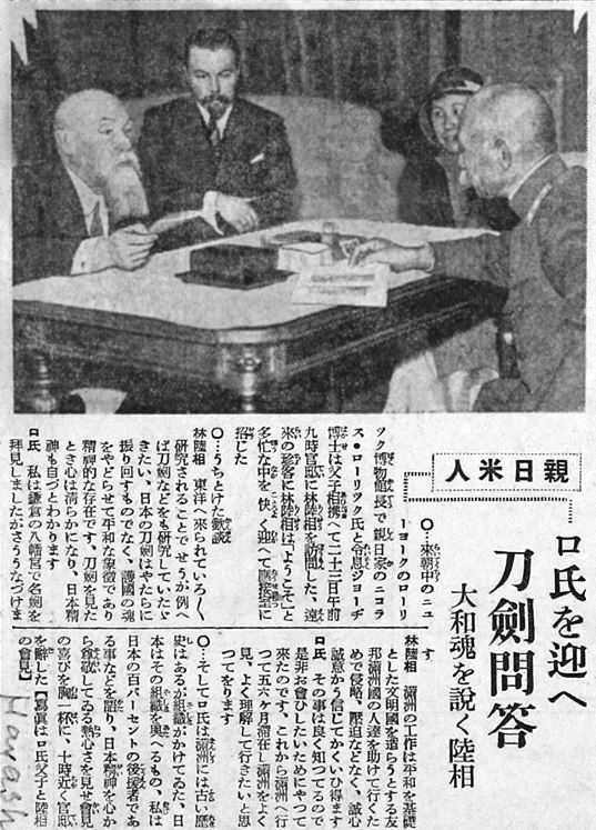 Публикация о встрече Н. К. и Ю. Н. Рерихов с военным министром Японии генералом С. Хаяши (май 1934 г., Токио)