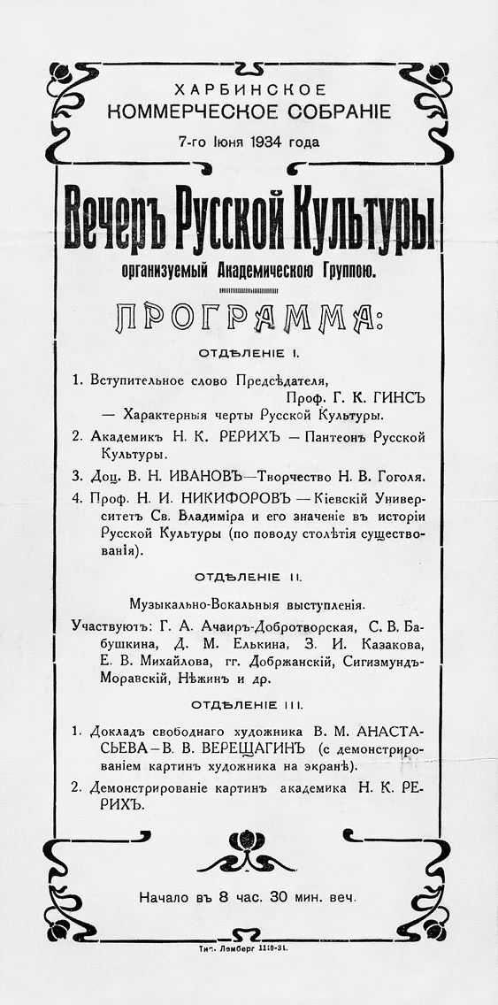 Программа Вечера русской культуры в Харбине с участием Н. К. Рериха