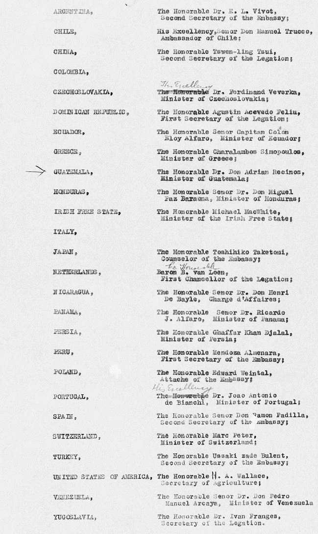 Список министров, послов, советников, секретарей посольств, приглашенных на Третью международную конференцию, посвященную Знамени Мира (17–18 ноября 1933 г., Вашингтон)