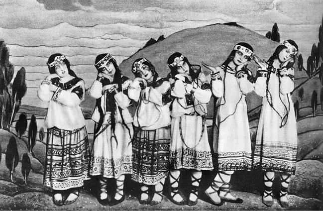 После дня и после полуночи. Камни заклятые по холмам лежат. Ведут девушки игры тайные. Ищут пути великого. Славят-величают жертву избранную. Призовут старцев, свидетелей праведных. Человеки-праотцы мудрые смотрят жертву великую. Воздадут жертву Яриле прекрасному, красному.