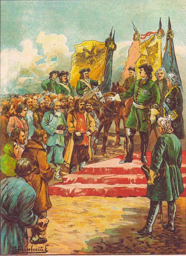Полтавская победа прославила Россию. Другие земли стали удивляться её богатству и могуществу, храбрости её войск и величию её царя Петра. Митрополит от имени всего народа назвал Петра Великим Императором, и с тех пор весь мир так его называет.