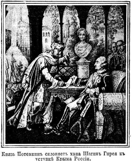 А у татар князь Потёмкин, по повелению Екатерины Великой, отнял целую страну по имени Крым, или Тавриду. Щедро наградила Екатерина Великая своих храбрых полководцев и повелела Орлову называться графом Чесменским, а Потёмкину – князем Таврическим.
