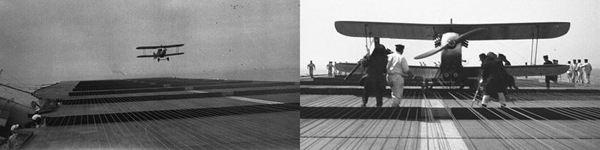 Посадка американского палубного торпедоносца «Дуглас» DT-2 на авианосец «Лэнгли», 1925 год. Хорошо видно сочетание продольных аэрофинишёров «британской схемы», но поддерживаемых уже не рампами, а рядами складывающихся дощечек (по одной на трос), а также аэрофинишёров с поперечными тросами (видны слева, в кормовой части палубы).