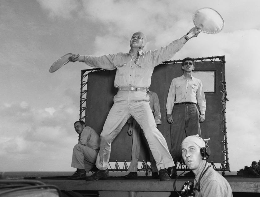 Посадочный сигнальщик корректирует действия совершающего посадку пилота. Авианосец CV-6 «Энтерпрайз», 1945 год.