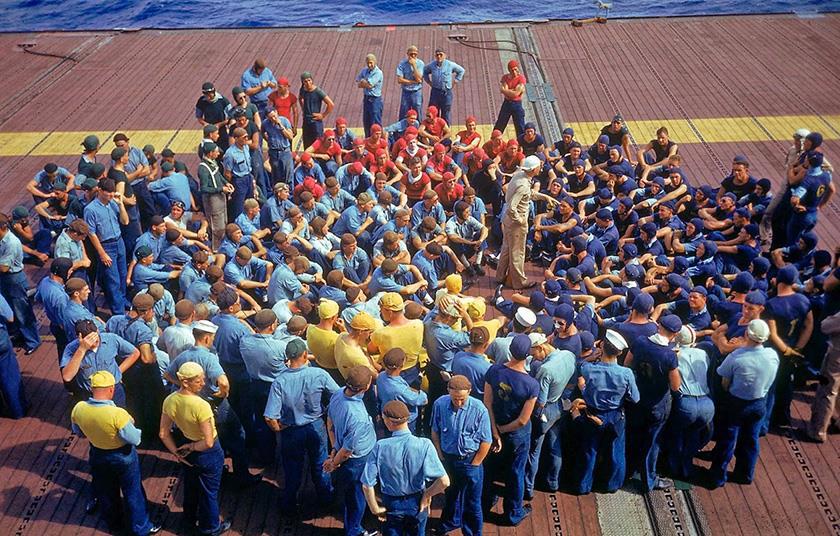 Руководитель палубных операций проводит инструктаж палубной команды. Авианосец CV-6 «Энтерпрайз», 1940 год.