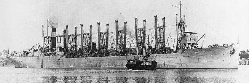 Угольщик AC-3 «Юпитер» вскоре после вступления в строй, Калифорния, 16 октября 1913 года. Бóльшую часть корпуса судна занимают 6 угольных трюмов (расположены между конструкциями для погрузки-разгрузки угля).
