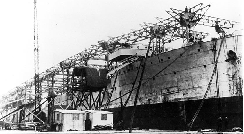 Перестройка угольщика AC-3 «Юпитер» в авианосец, 1921 год. Идёт монтаж пиллерсов под будущую полётную палубу.