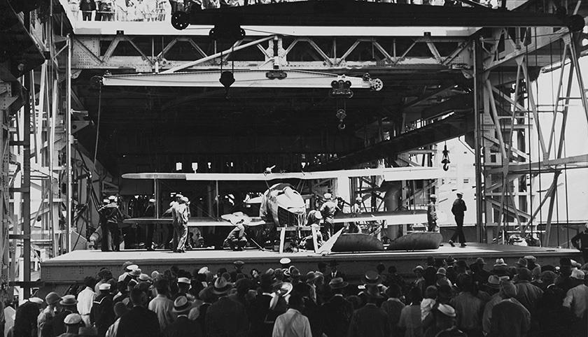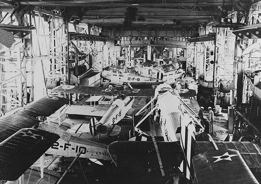 Приглашённая на авианосец «Лэнгли» публика наблюдает за предполётной сборкой извлечённого из трюма разведчика «Воут» O2U «Корсар», происходящей на платформе самолётоподъёмника. Обратите внимание, на какой высоте от бывшей верхней палубы корабля находится платформа – это её самая нижняя позиция. Сверху также видны обе кран-балки, использовавшиеся для перемещения самолётов.