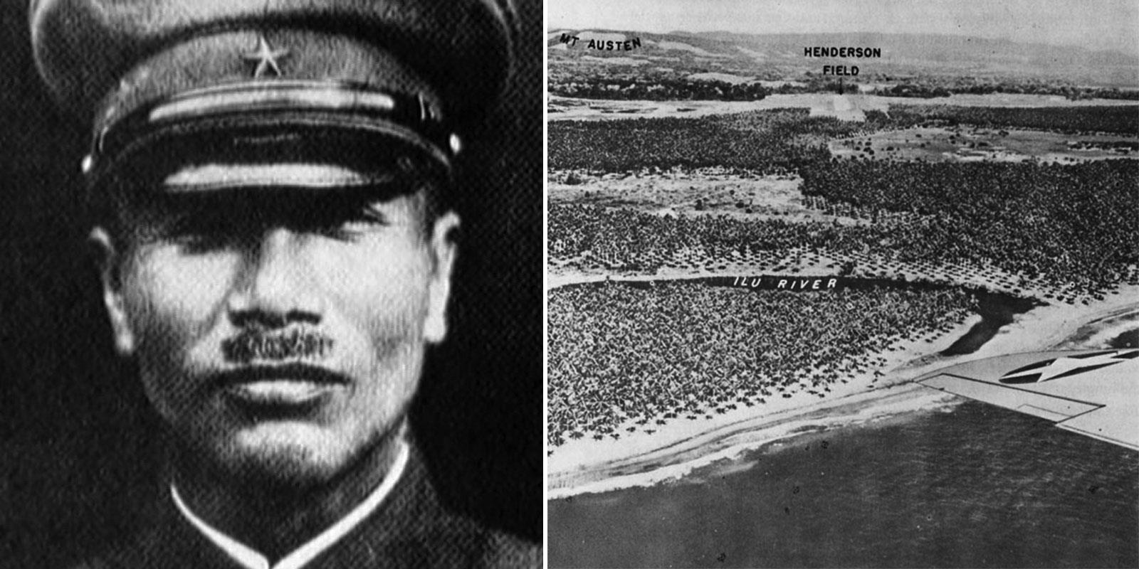 Полковник Киёнао Итики и аэрофотоснимок района боя. У крыла самолёта видна та самая песчаная коса в устье реки Илу, вокруг которой и развернулись основные события, а чуть дальше – главная цель операции, аэродром Хендерсон-Филд.