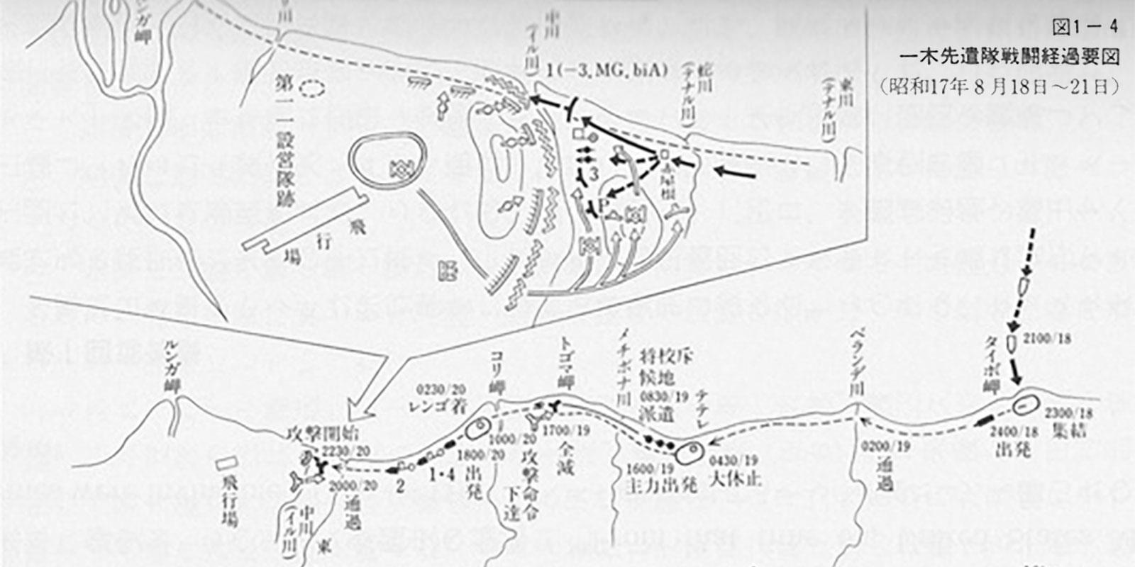Схема марша отряда Итики от места высадки (снизу) и собственно боя (сверху). Иллюстрация из «Сэнси сёсо», официального японского многотомника по истории Тихоокеанской войны.
