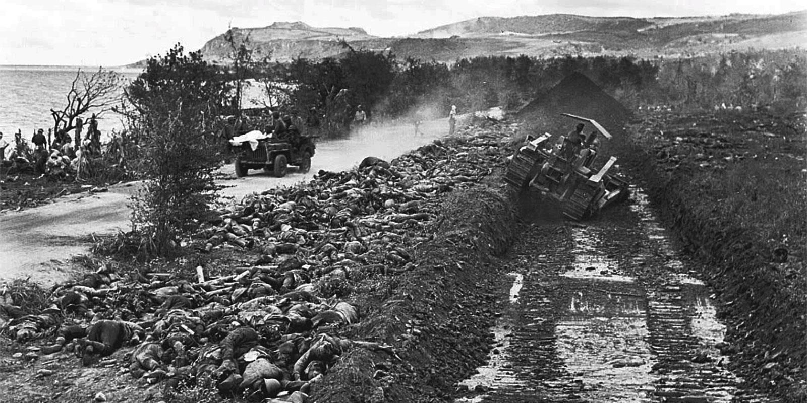 Остров Сайпан. Бульдозер копает братскую могилу для погибших японских солдат, лежащих слева.