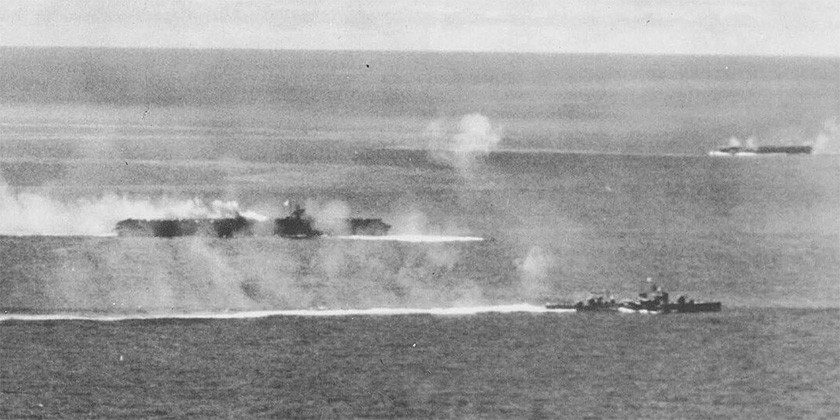 Группа торпедоносцев и пикировщиков с обоих авианосцев вылетела на поиски американцев. Они никого не нашли, сбросили боекомплект в море и легли на обратный курс. По закону подлости тот, естественно, пролегал почти прямо над ненайденным американским соединением. А уже наступили сумерки, так что часть японских самолётов, увидев под собой белые кильватерные следы, решили, что под ними уже свои авианосцы, удивились чего они тут делают, но начали бодро заходить на посадку. И удивились ещё сильней, когда вместо посадочных огней их встретили залпы зениток, которые, впрочем, ни в кого не попали.