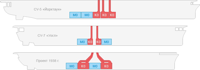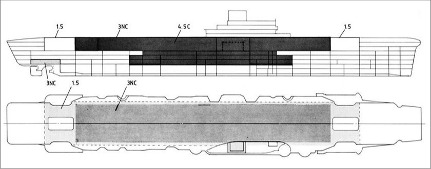 Причём бронированной была далеко не вся полётная палуба – речь шла лишь о том её куске, что являлся «крышей» ангара. То есть не на всю ширину и немного больше половины длины, а именно между кормовым и носовым самолётоподъёмниками, что остались такими же узенькими – от центрального пришлось отказаться, дабы не ослаблять всю конструкцию. Сами платформы самолётоподъёмников бронированными уже не были – считалось, что от попаданий в них защитят бронированные «ворота», что отделяли шахты подъёмников от ангара.